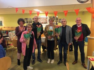 Op deze kleurrijke foto zien we (v.l.n.r.) Willemijn Koning, Elly Vreugdenhil, Ron Veltman, Astrid Veltman, Ron Pieters en Dik Middelkoop. Helaas ontbreekt Lukas Burgering, maar ook hij heeft natuurlijk een boeket ontvangen.